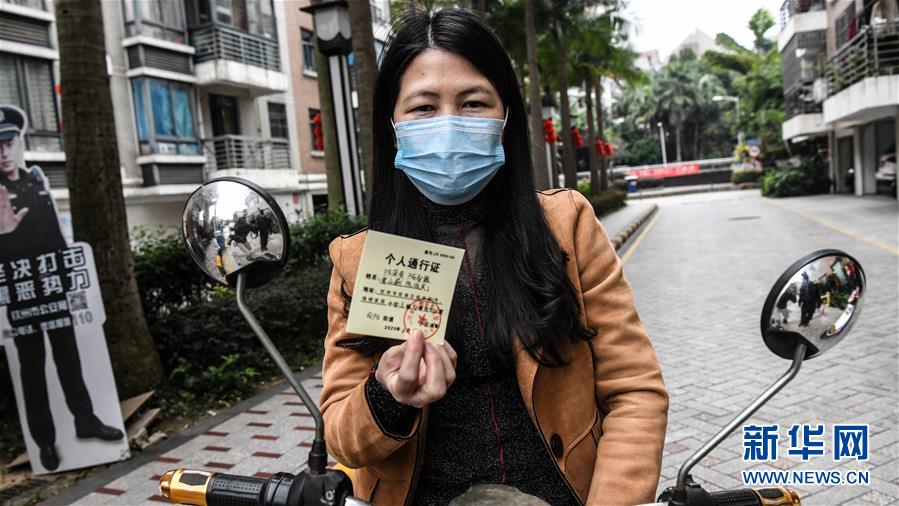 2月19日,在广西钦州市钦南区向阳街道锦绣家园小区门前,一名外出市民向工作人员出示出入证。新华社记者 张爱林 摄