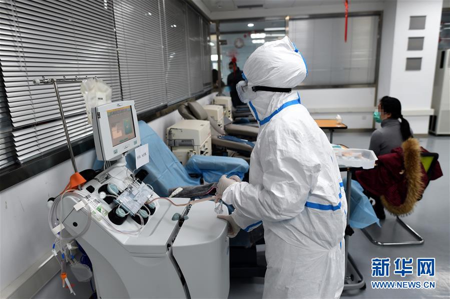 2月19日,在位于杭州的浙江省血液中心滨江院区,工作人员(左)开展采集血浆前的准备工作。 当日,4名新冠肺炎康复者来到位于杭州的浙江省血液中心滨江院区集中捐献血浆。即日起,浙江全省的新冠肺炎康复者捐献血浆工作正式全面启动。此前浙江部分地区已开展单人次的新冠肺炎康复者捐献血浆采集,用于危重新冠肺炎患者的治疗。 新华社记者 韩传号 摄