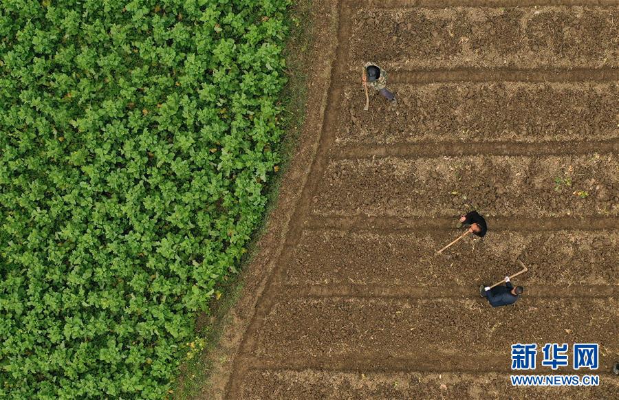 2月19日,在贵州省铜仁市玉屏侗族自治县朱家场镇混寨村,村民在田间劳作(无人机照片)。新华社发(胡攀学 摄)