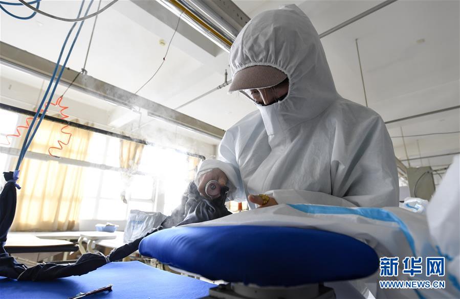 2月19日,工人在宁夏汇川服装有限公司生产车间熨烫民用隔离服。 近日,位于银川市的宁夏汇川服装有限公司积极组织员工复工并转产赶制民用隔离服。据了解,该公司是一家具有特种劳动防护用品生产资质的企业。为保障疫情期间当地防护用品供应,公司加快设计研发民用隔离服,目前已搭建3条生产流水线,近60名员工日产民用隔离服500-700套。 新华社记者冯开华摄