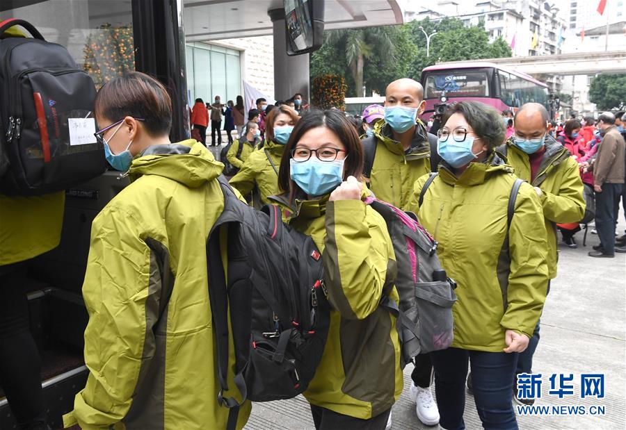 2月19日,在位于南宁的广西壮族自治区卫生健康委员会,医疗队队员准备乘车前往机场。新华社记者 周华 摄