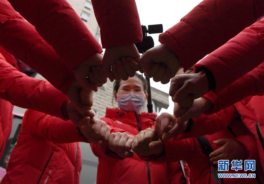 2月19日,在位于南宁的广西壮族自治区卫生健康委员会,医疗队队员在出发前相互加油鼓励。新华社记者 周华 摄