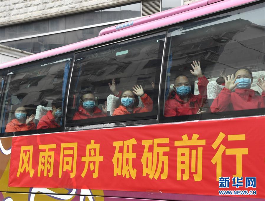 2月19日,在位于南宁的广西壮族自治区卫生健康委员会,医疗队队员乘车前往机场。新华社记者 周华 摄