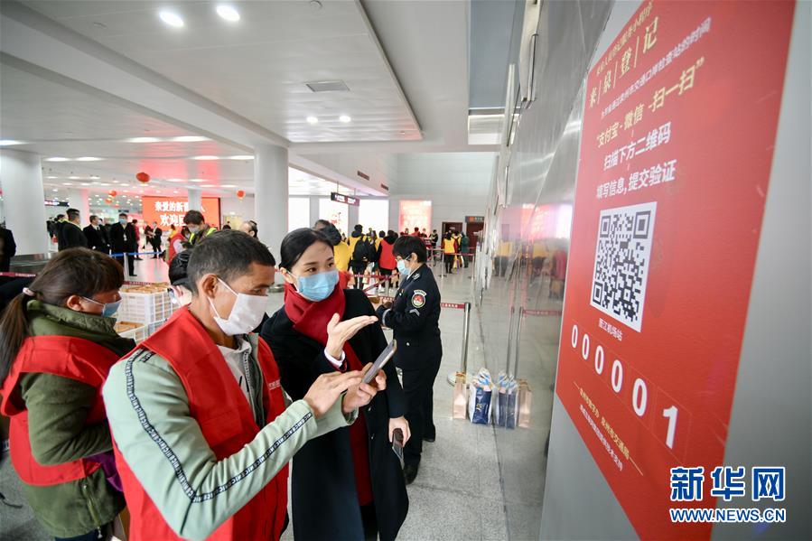 2月19日,在福建泉州晋江国际机场,工作人员指导刚刚抵达的云南籍务工人员用手机扫码登记身份信息。新华社记者 姜克红 摄