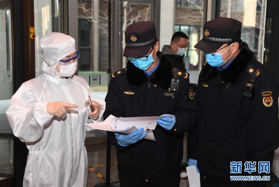 2月19日,在所管片区的一座写字楼里,张辉登(中)在询问工作人员(左)写字楼的防疫情况。 张辉登是北京市海淀区北太平庄街道综合行政执法队副队长,主要负责在明光村社区值守社区防疫岗。明光村社区约有流动人口12000余人,人员复杂稠密。每到工作时间,张辉登都会站在明光村社区防控排查登记点,认真核对进出人员的出入证、身份证,帮大家测量体温并登记,提醒居民出门戴好口罩、回家消毒。随着企事业单位复工复产,张辉登还要和同事一起对所管片区的部分商务楼宇、门店等进行检查,督促相关单位落实好各项防疫措施。 张辉登的妻子张盼盼从事医护工作14年,目前在中日友好医院急诊科承担接收疑似病人的任务。工作之余,张辉登总会抓紧时间给奋战在抗疫一线的爱人拨个电话或是发个微信互报平安。为了安心工作,夫妻俩春节过后把女儿张若语送回了山东老家,由孩子的姥姥姥爷照顾。 牺牲小家,奉献大家,张辉登是奋战在防控疫情一线的街道工作人员的缩影。他们默默守护着社区中的居民,为基层防疫工作奉献自己的力量。 新华社记者 任超 摄