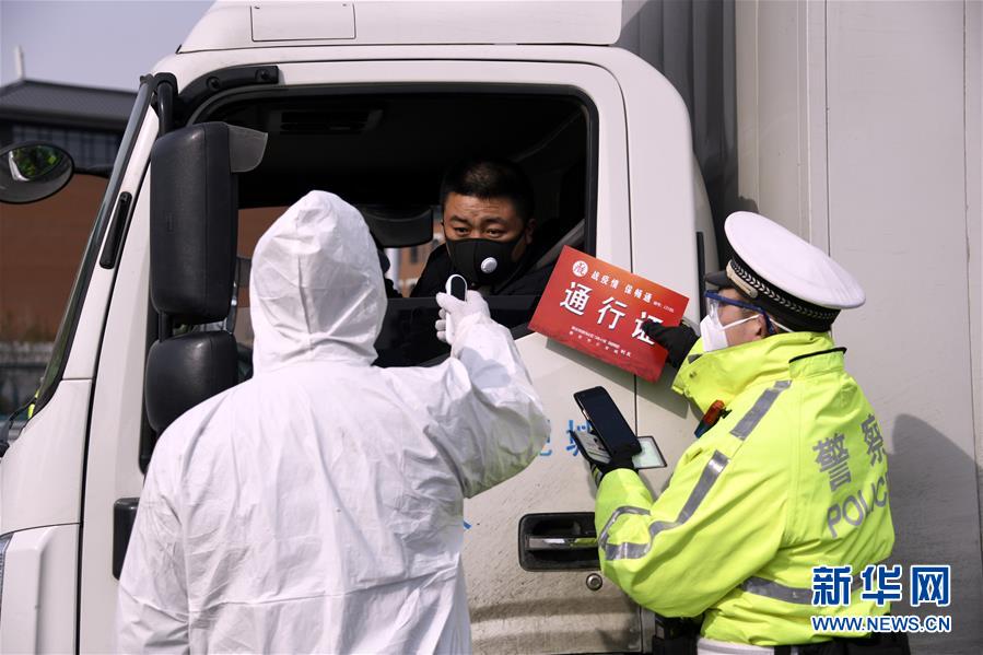 2月19日,在山东高速京台高速国际医学中心收费站,济南槐荫交警大队民警检查货车通行证。新华社记者 范长国 摄