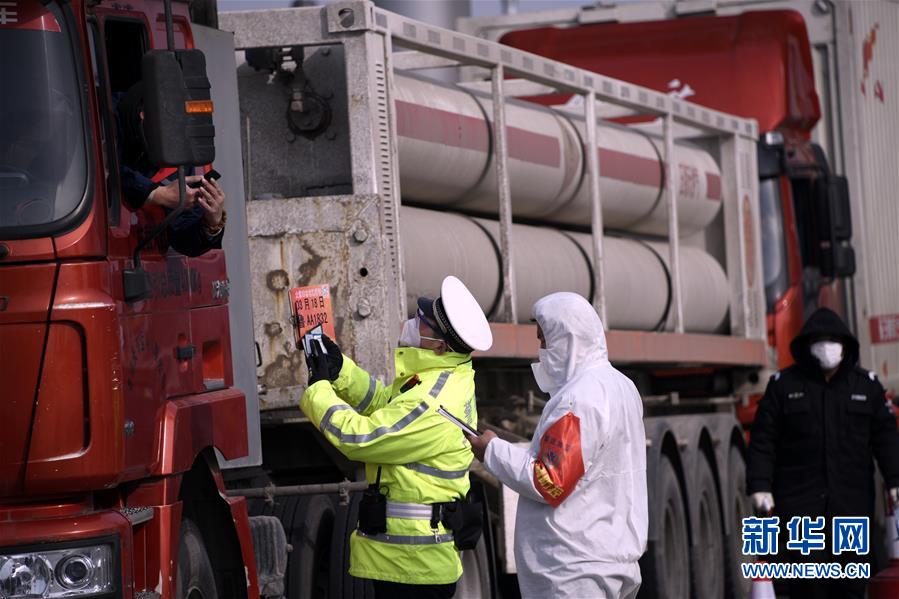 2月19日,在山东高速京台高速国际医学中心收费站,济南槐荫交警大队民警和疫情防控人员联合对车辆进行检查。新华社记者 范长国 摄