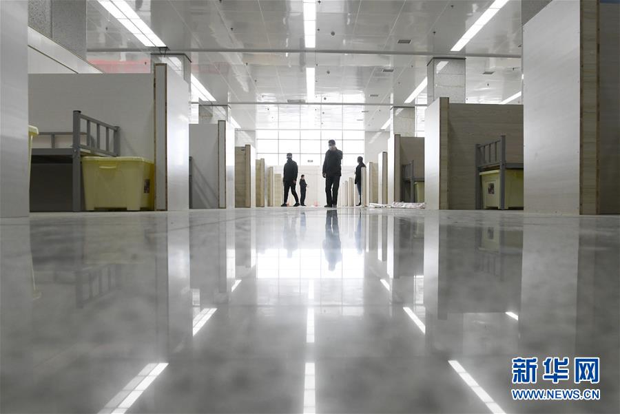 2月19日,汉口北客运中心方舱医院内部病房部分已经基本完成建设和清洁。由中铁大桥局集团有限公司参与建设的汉口北客运中心方舱医院计划当日完工,将提供两千个床位。新华社记者 程敏 摄