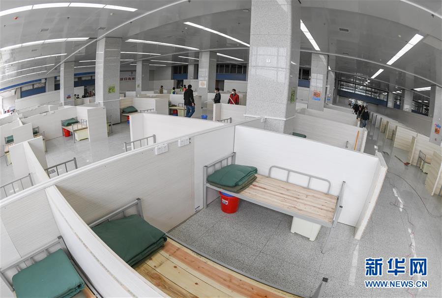 2月19日,汉口北客运中心方舱医院内部病房部分已经基本完成。由中铁大桥局集团有限公司参与建设的汉口北客运中心方舱医院计划当日完工,将提供两千个床位。新华社记者 程敏 摄