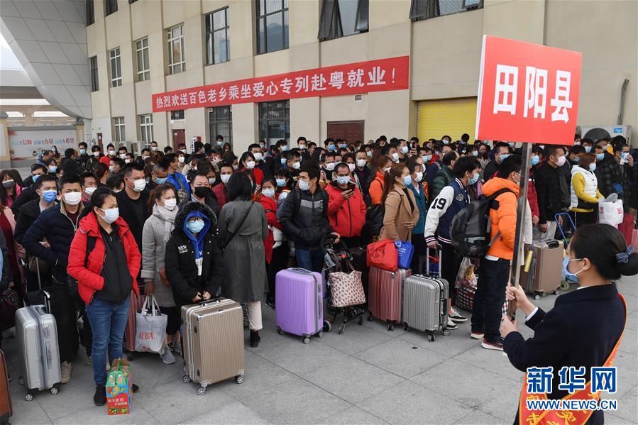 2月19日,外出务工人员排队准备进入百色火车站。新华社记者 陆波岸 摄