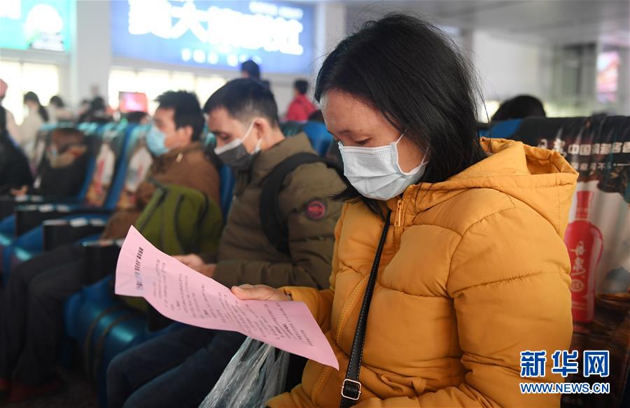 2月19日,在广西百色站,外出务工人员在阅读出行须知。新华社记者 陆波岸 摄