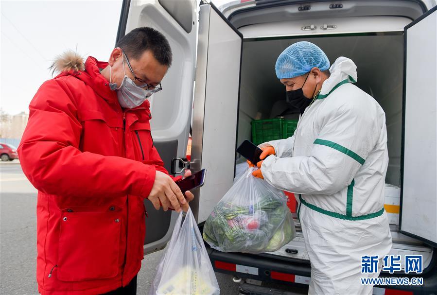 2月19日,在呼和浩特市一小区门口,呼和浩特市绿林源农业科技开发有限公司配送员(右)在配送蔬菜。 新冠肺炎疫情发生以来,内蒙古呼和浩特市青城金谷农牧业发展有限公司落实政府疫情防控决策部署,开通“敕勒川农博商城”电商平台,为当地农牧业供应企业及合作社提供销售渠道,平台实现线上下单、商品配送到小区,切实保障了疫情期间市民蔬菜、肉蛋奶、粮油等物资的供应。据了解,目前入驻“敕勒川农博商城”的内蒙古企业已有100余家,商品500多种。 新华社记者 连振 摄