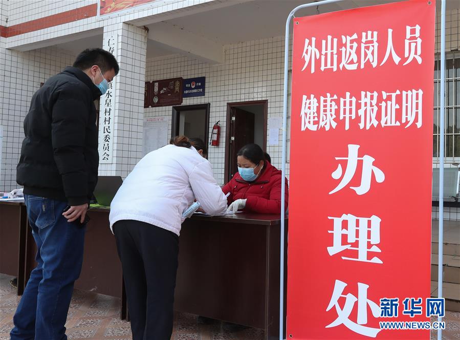 2月19日,在四川省仁寿县曹家镇水星村,准备外出务工的村民在办理外出返岗人员健康申报证明。新华社记者 江宏景 摄