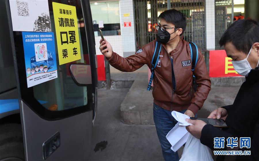 2月19日,在四川省仁寿县联营汽车客运站,外出务工人员登车前进行扫码登记。新华社记者 江宏景 摄