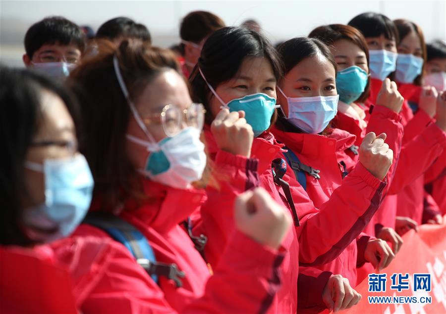 2月19日,医疗队员在出征仪式前合影。新华社记者 贾浩成 摄