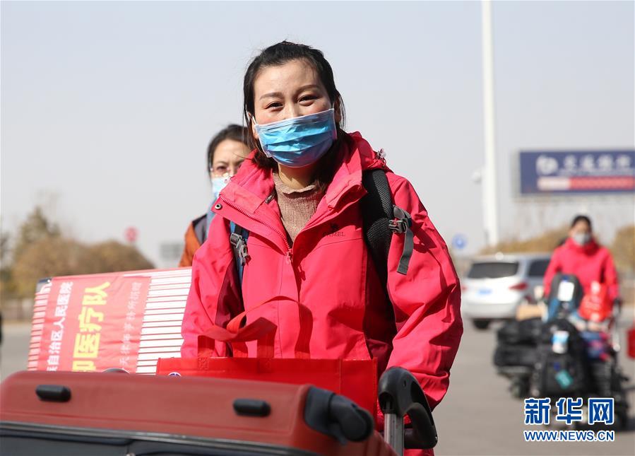 2月19日,医疗队员携行李走入机场。新华社记者 贾浩成 摄