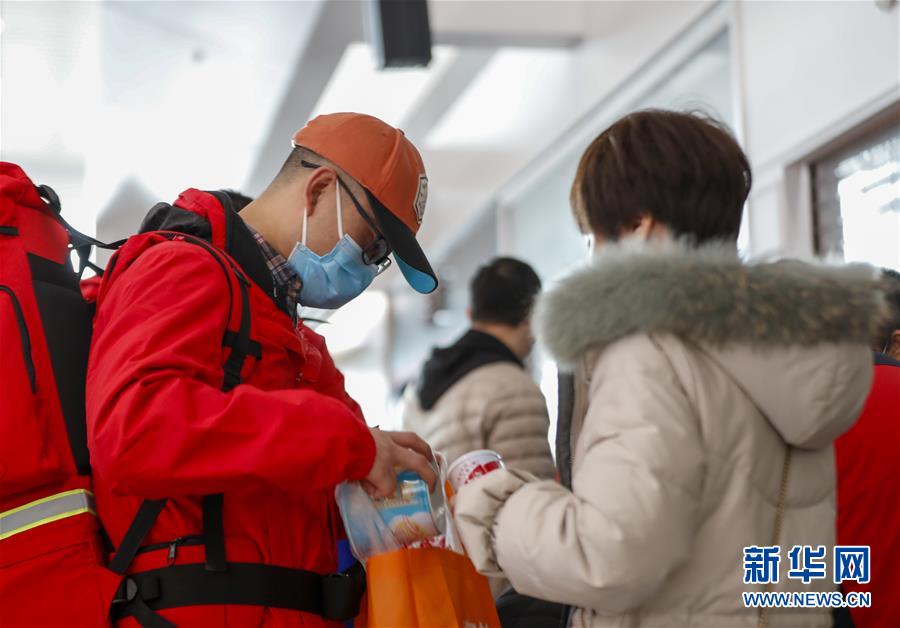 2月19日,在重庆江北国际机场,一名重庆市第十二批医疗队队员(左)在登机前查看家人准备的物品。新华社发(黄伟 摄)
