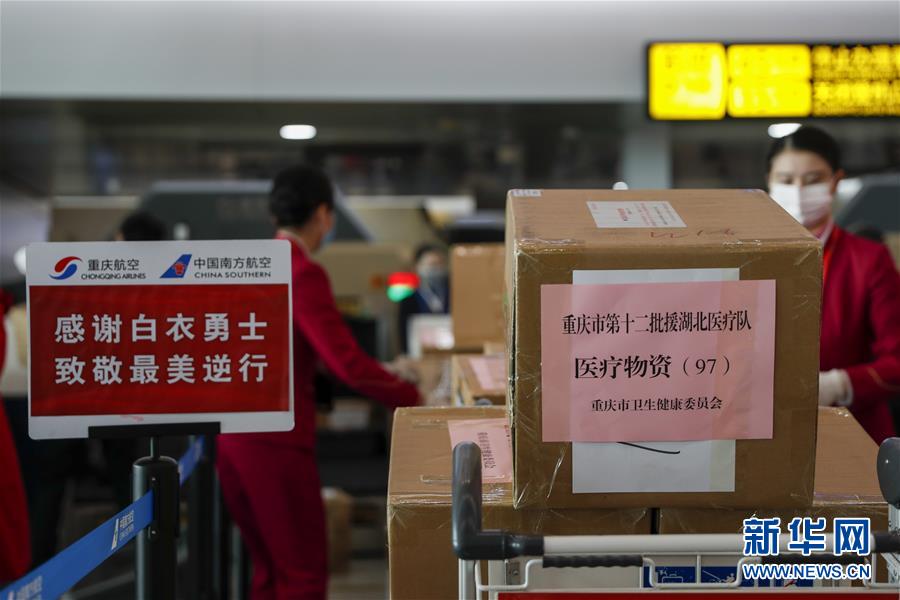 2月19日,在重庆江北国际机场,重庆市第十二批医疗队的随队物资在托运。新华社发(黄伟 摄)