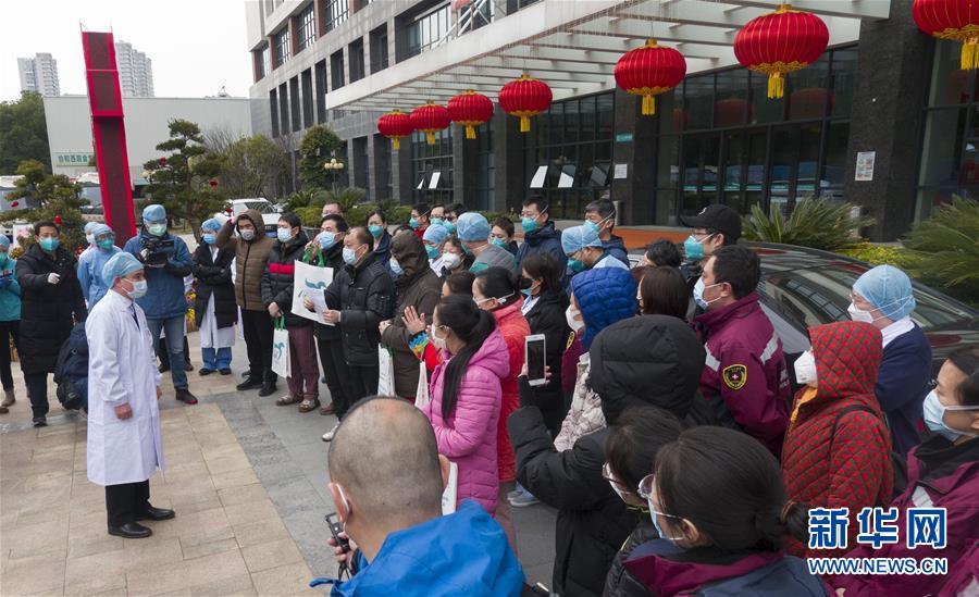 2月19日,在武汉协和医院西院区,医院党委书记张玉(左侧穿白大褂者)嘱咐康复出院的新冠肺炎重症患者回家后的注意事项。新华社记者 才扬 摄