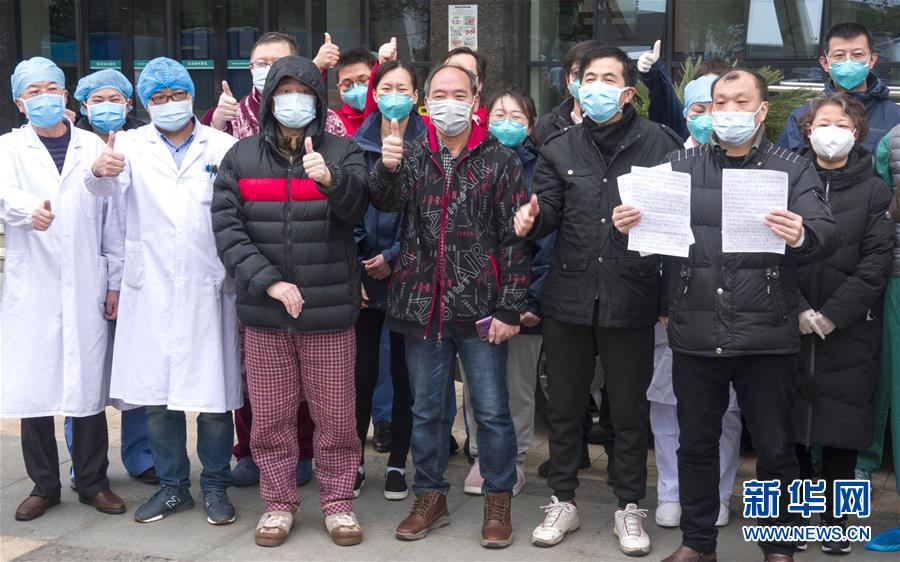 2月19日,在武汉协和医院西院区,康复出院的新冠肺炎重症患者与医护人员合影留念。新华社记者 才扬 摄