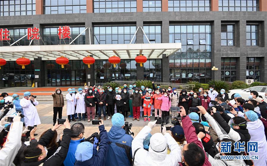 2月19日,在武汉协和医院西院区,康复出院的新冠肺炎重症患者与医护人员合影留念。新华社记者 陈晔华 摄