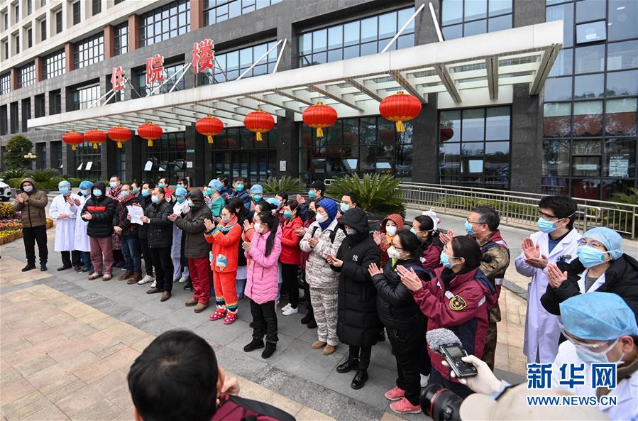 2月19日,在武汉协和医院西院区,康复出院的新冠肺炎重症患者与医护人员合影留念。新华社记者 陈晔华 摄
