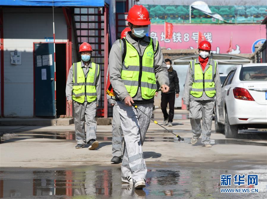 2月19日,中铁二局一名职工防疫员在宿舍区喷洒消毒药水。新华社记者 李紫恒 摄