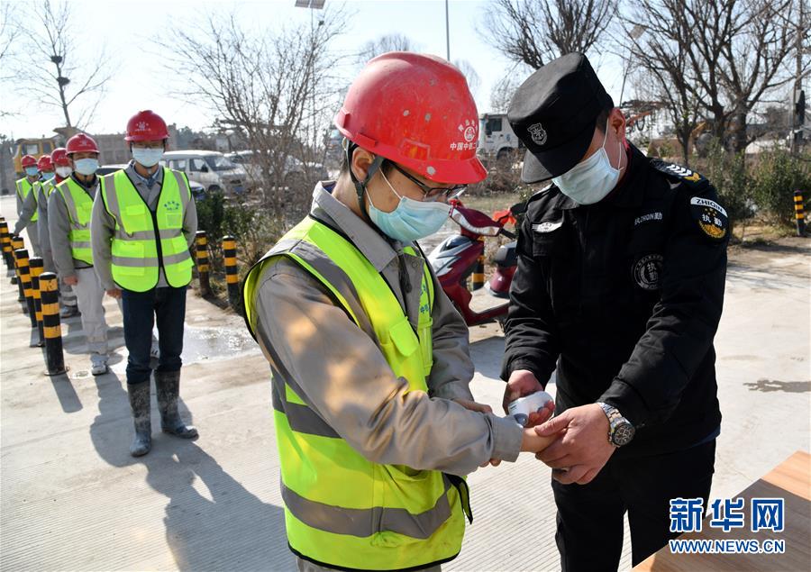 2月19日,中铁二局职工进入青岛地铁8号线工作区前间隔排队进行体温测量。新华社记者 李紫恒 摄