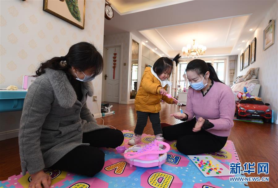 2月19日,在南京市紫峰公馆小区家中,董杰(右)和婆婆一起陪女儿玩耍。新华社记者季春鹏摄