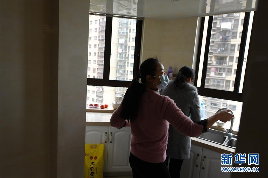 2月19日,在南京市紫峰公馆小区家中,董杰(左)和婆婆在厨房准备午饭。新华社记者季春鹏摄