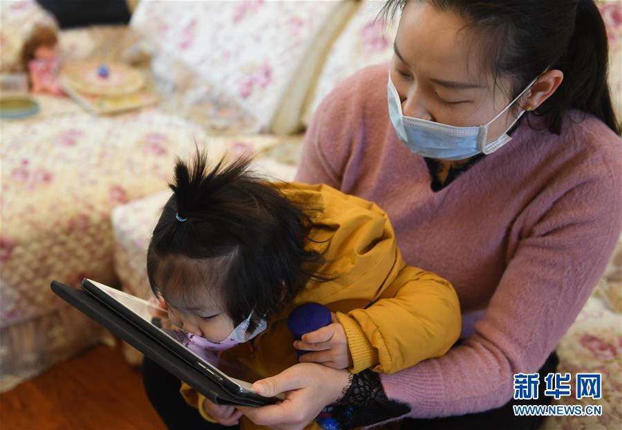 2月19日,女儿在与柯章敏视频通话时亲吻平板电脑里的爸爸。新华社记者季春鹏摄