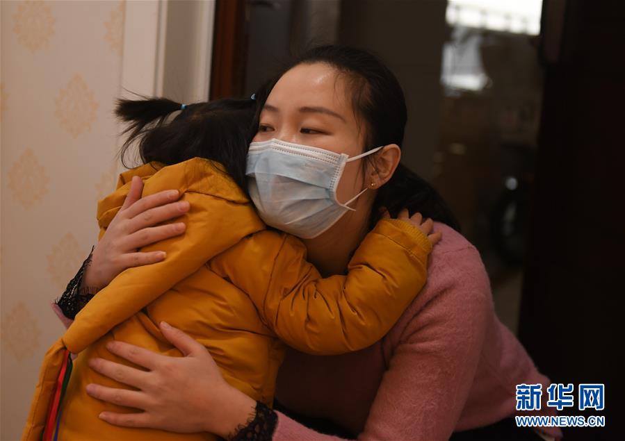 2月19日,在南京市紫峰公馆小区家中,董杰准备出门工作,女儿依依不舍。新华社记者季春鹏摄