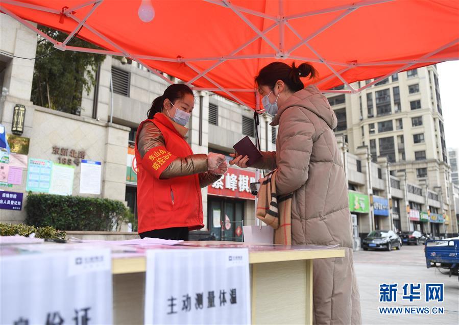 2月19日,在南京市紫峰公馆小区门前的疫情防控值班点,董杰(左)核查居民的出入证件。新华社记者季春鹏摄
