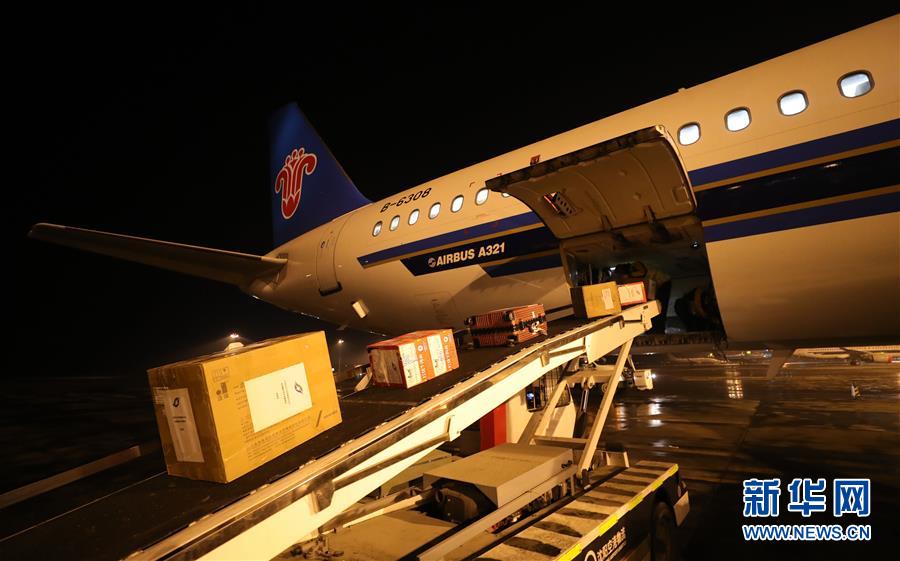 辽宁驰援湖北襄阳的医疗物资和医疗队队员行李被运送上飞机(2月12日)。新华社记者 杨青 摄