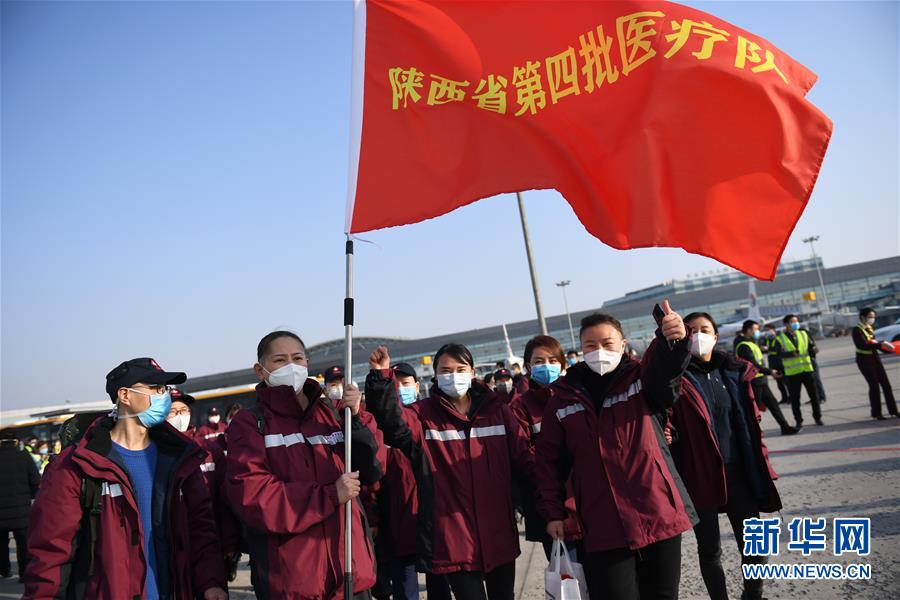 2月19日,陕西省第四批支援湖北医疗队队员在西安咸阳国际机场准备登机出发。新华社记者 李一博 摄