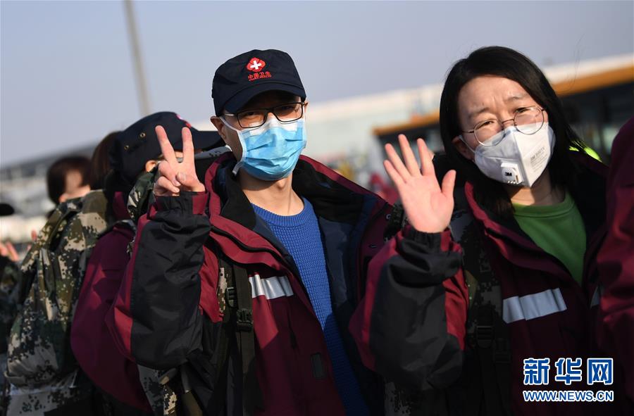 2月19日,陕西省第四批支援湖北医疗队队员在西安咸阳国际机场准备登机出发。新华社记者 李一博 摄