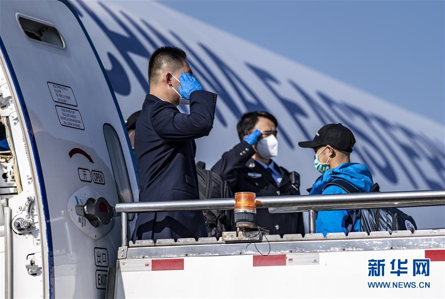 2月19日,医疗队队员从昆明长水国际机场登机出发,机组人员在舱门前迎接。 当日,由150余名医护人员组成的云南第六批支援湖北抗疫医疗队从昆明出发。 新华社记者 江文耀 摄