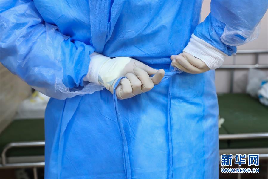 2月19日,一名医疗队队员练习穿隔离衣。新华社记者 张玉薇 摄