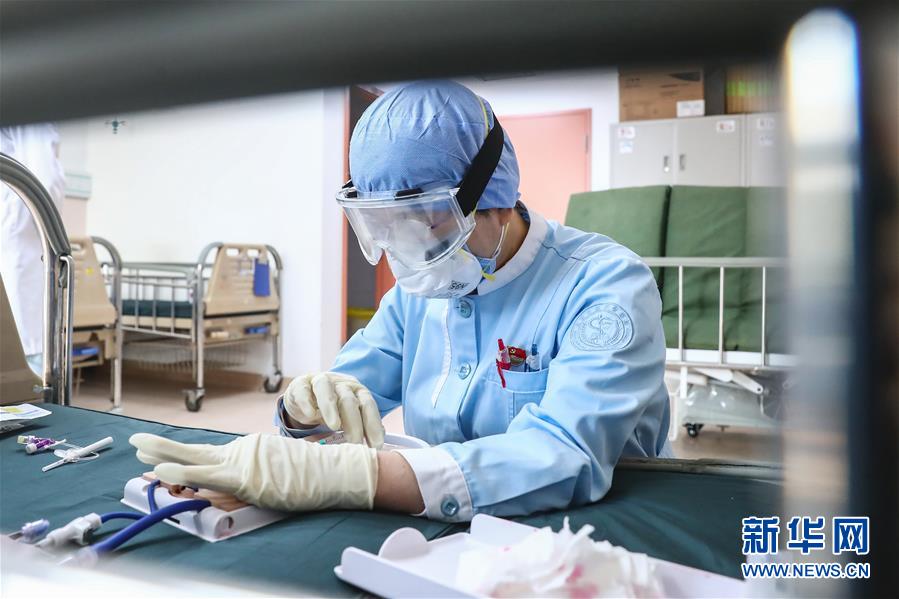 2月19日,一名医疗队队员戴双层胶皮手套和护目镜练习静脉穿刺。新华社记者 张玉薇 摄
