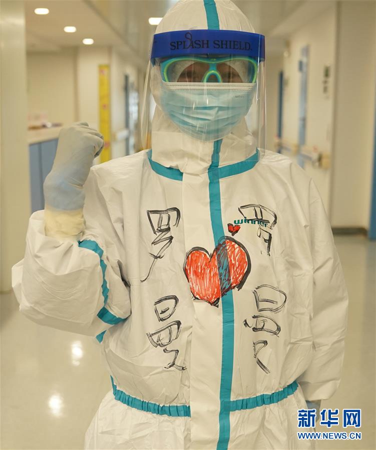 护士罗曼的防护服上画着“红心”(2月18日摄)。她希望病人看到红火的爱心,内心充满温暖。 新华社记者 王毓国 摄