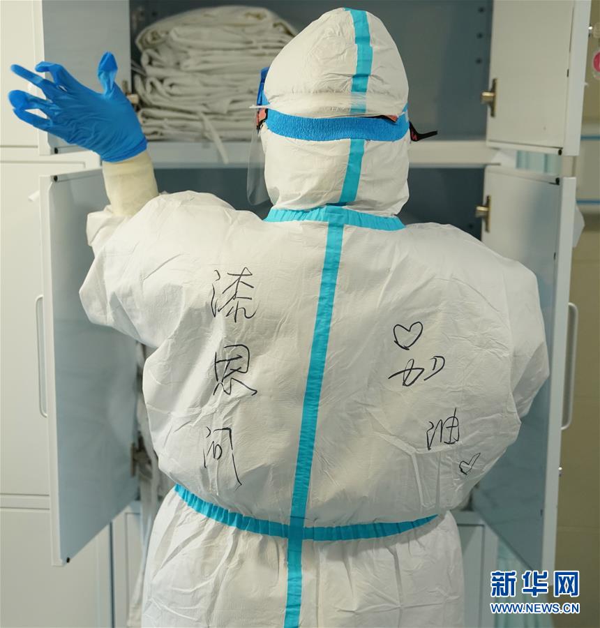 护士漆思河的防护服上写着“加油”(2月18日摄)。漆思河对待患者总是面带微笑、热情周到,被称为“小甜甜”。新华社记者 王毓国 摄