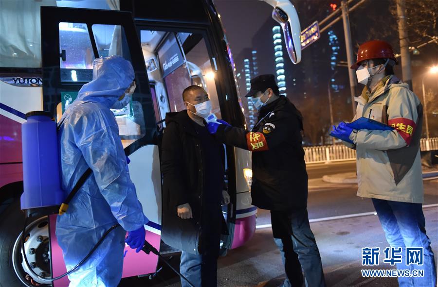 2月20日,工作人员对下车的返岗务工人员进行体温测量、信息登记。 当日,30名来自四川广元的务工人员乘坐返岗专车抵达北京市政路桥市政集团四公司地铁12号线10标项目所在地,他们是疫情期间该项目以“点对点”的方式接来的首批返京务工人员。抵达后,务工人员第一时间接受测温、消毒等防疫措施,并将进行为期14天的隔离观察。 新华社发(陈钟昊 摄)