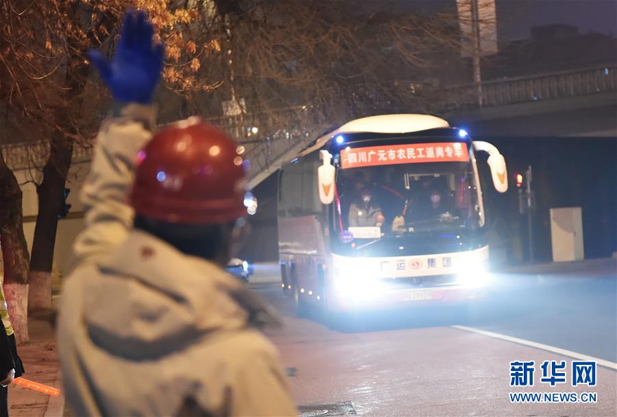 2月20日,工作人员引导返岗专车驶向项目所在地。 当日,30名来自四川广元的务工人员乘坐返岗专车抵达北京市政路桥市政集团四公司地铁12号线10标项目所在地,他们是疫情期间该项目以“点对点”的方式接来的首批返京务工人员。抵达后,务工人员第一时间接受测温、消毒等防疫措施,并将进行为期14天的隔离观察。 新华社发(陈钟昊 摄)