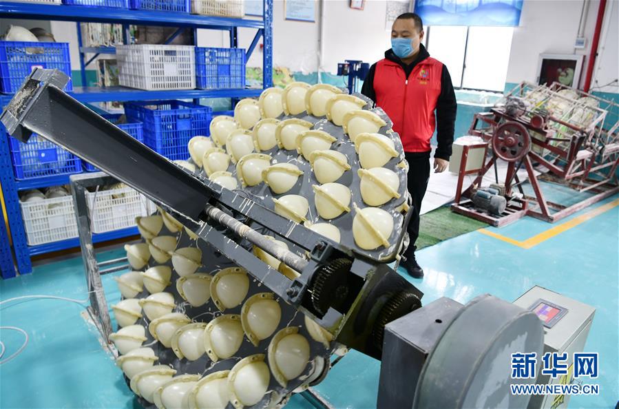 2月20日,在贵州省兴义市洒金街道栗坪社区的一家石膏模具扶贫车间,工人在加工石膏金蛋。 近日,贵州省兴义市洒金街道栗坪社区易地扶贫搬迁安置点的多个扶贫车间在做好新冠肺炎疫情防控的同时,陆续复工复产,确保搬迁群众搬得出、稳就业、能增收。 新华社记者 杨文斌 摄