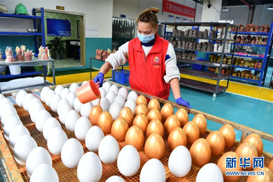 2月20日,在贵州省兴义市洒金街道栗坪社区的一家石膏模具扶贫车间,工人在加工石膏金蛋。 近日,贵州省兴义市洒金街道栗坪社区易地扶贫搬迁安置点的多个扶贫车间在做好新冠肺炎疫情防控的同时,陆续复工复产,确保搬迁群众搬得出、稳就业、能增收。 新华社记者 杨文斌 摄