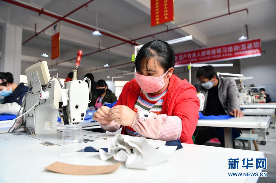 2月20日,在贵州省兴义市洒金街道栗坪社区的一家制作服饰的扶贫车间,工人在加工服饰。 近日,贵州省兴义市洒金街道栗坪社区易地扶贫搬迁安置点的多个扶贫车间在做好新冠肺炎疫情防控的同时,陆续复工复产,确保搬迁群众搬得出、稳就业、能增收。 新华社记者 杨文斌 摄