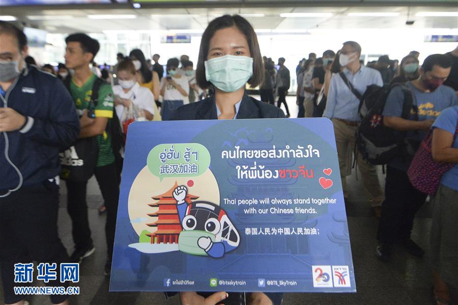 2月7日,在泰国曼谷,当地民众在天铁车站内手举“武汉加油”的标语牌。 新华社发(拉亨 摄)