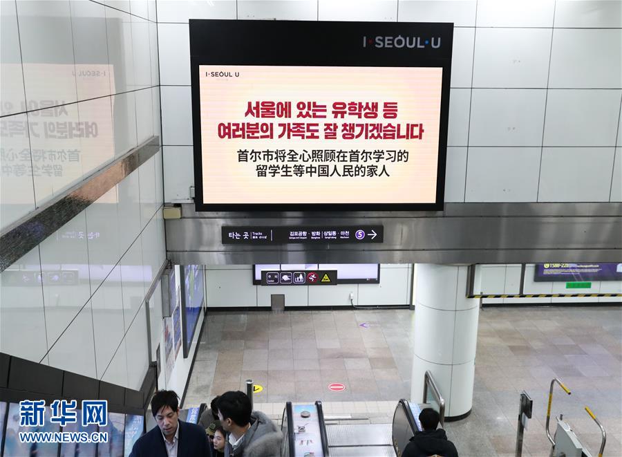 2月18日,韩国首尔市光化门地铁站大屏幕播出为中国加油的视频。 新华社记者 王婧嫱 摄
