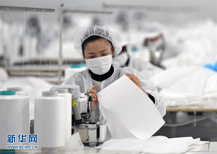 1月28日,在仙桃市湖北裕民防护用品有限公司生产车间内,工人在生产医用防护用品。 新华社记者 李贺 摄