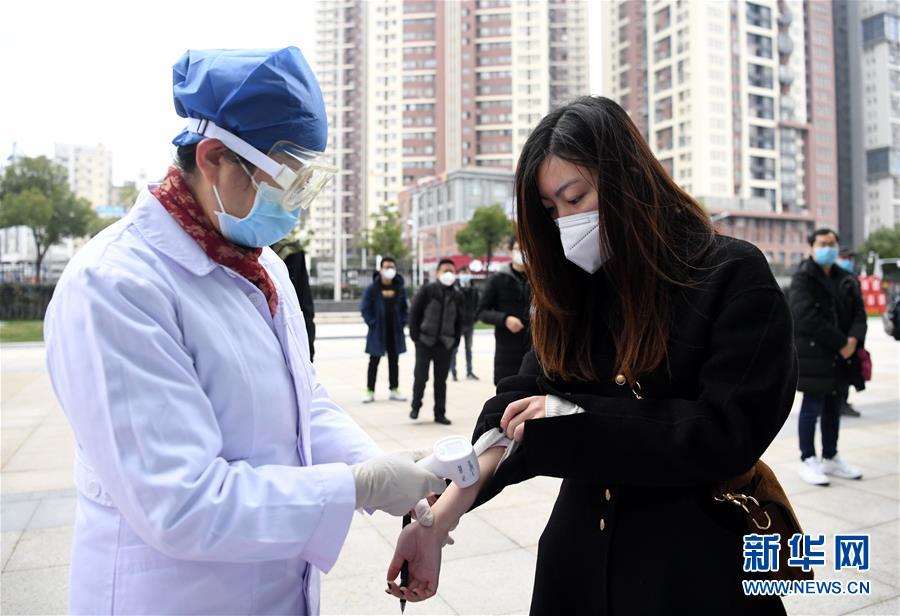2月21日,返岗建设者在乘坐专线大巴出发前测量体温。 当日,中铁四局杭绍台铁路7标项目安排返岗专线大巴接25名建设者从安徽合肥出发返回项目所在地浙江台州,在做好疫情防控工作的同时,确保人员及时到岗,保障重点工程进度。 新华社记者刘军喜摄